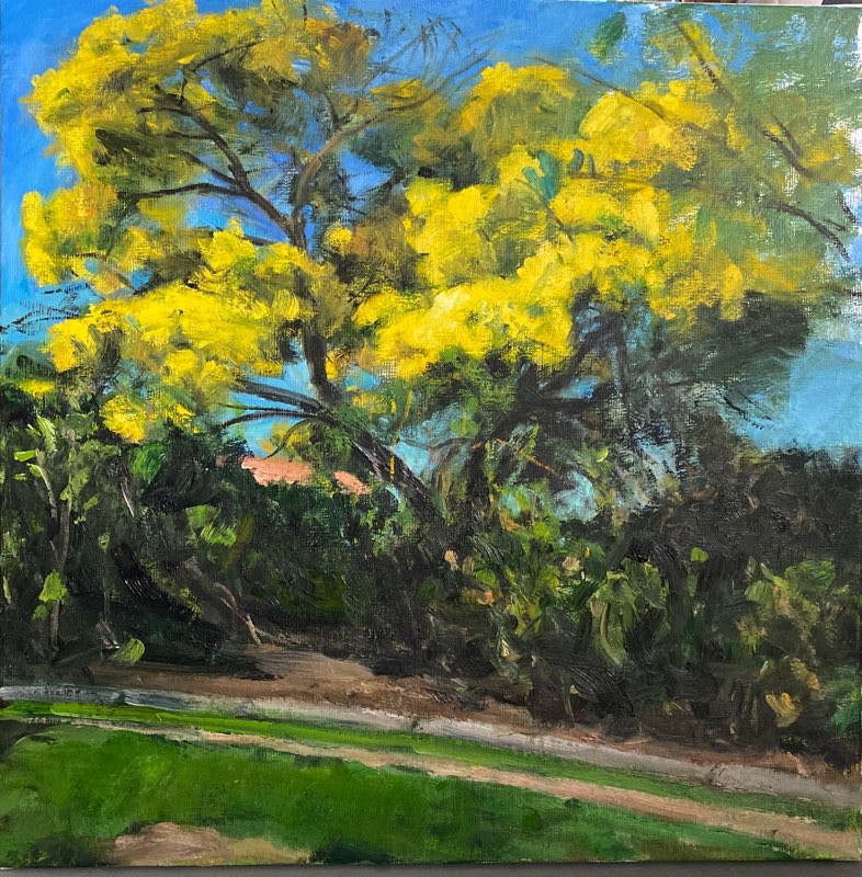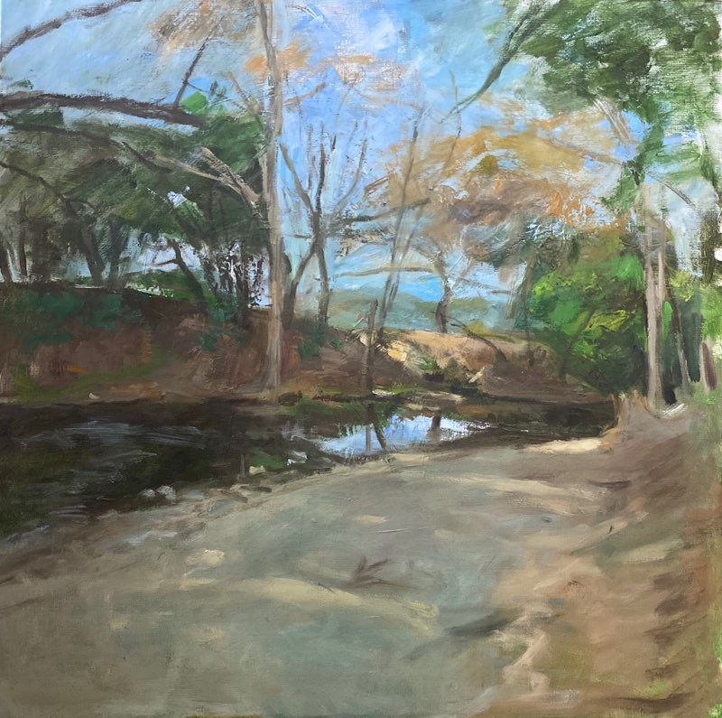 Nouvelle étude sur le motif, toile 60×76 . Déclinaison de verts d’après un motif des Alpes de Hautes ProvenceToile de 54×65. Paysage de Provence ou la lumière est le sujet principal. Un coin de campagne vert brun bleu.Toile de 50×50 étude de paysage, rivière sous un sous bois.VarMimosas en Provence Toile de 80×80. Travail sur le motif, 20 séances.